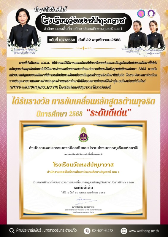 โรงเรียนวัดหงส์ปทุมาวาส ได้รับรางวัล การขับเคลื่อนหลักสูตรต้านทุจริต ปีการศึกษา 2568 "ระดับดีเด่น"
