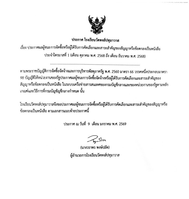 ประกาศผลผู้ชนะการจัดซื้อหรือผู้ได้รับการคัดเลือกและสาระสำคัญของสัญญาหรือข้อตกลงเป็นหนังสือ