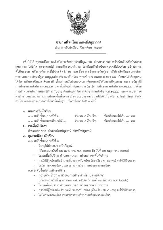 ประกาศรับนักเรียน ปีการศึกษา 2569